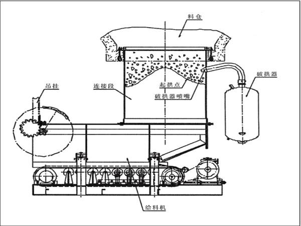 自動(dòng)破拱給料機(jī)為了防止在給料機(jī)距離倉口較高的時(shí)候,連接段內(nèi)的物料壓實(shí)粘結(jié)成拱或粘壁,使物料不能從連接段內(nèi)排出或減少連接段的有效容量,因此采用了在連接段上安裝PF系列破拱器。自動(dòng)破拱給料機(jī)利用壓縮空氣時(shí)瞬間產(chǎn)生的爆破力,對物料產(chǎn)生爆破、切割效應(yīng),以達(dá)到良好的疏通效果。